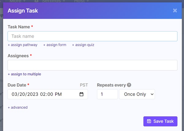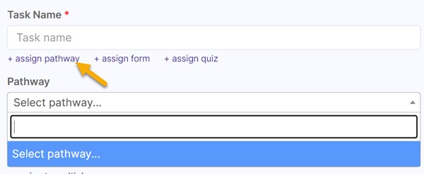 Click "+ assign pathway" to associate task with a pathway (form, or quiz). The Pathway may include user inputs such as checklists that must be completed before the task is marked complete.