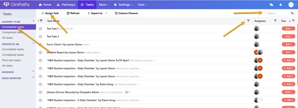 On the tasks view page, filter tasks using links in left panel, search using input in upper right, and filter or sort on columns. Click "Assign Task"  to assign a new task.