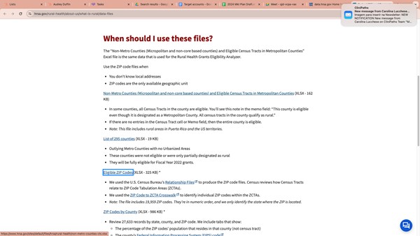 Hi Jeff and Tiff, I have included you both since you were also on the call about target accounts. Could you take a look at the file attached and let me know if it looks right? It's re: zip codes from rural areas, so I can match them against the AAWC list. Thanks!